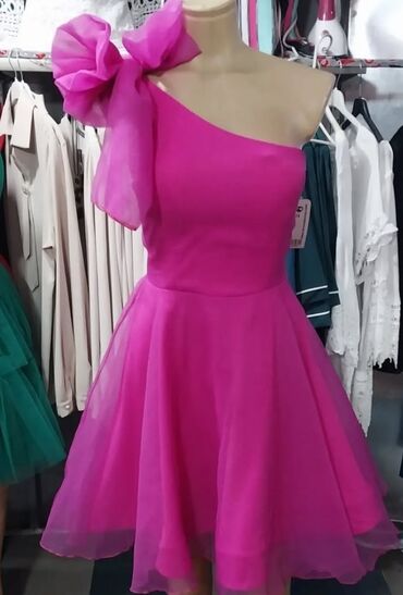 Koktel haljina u živopisnoj fuksija boji. Asimetrični kroj na jedno rame sa velikom dekorativnom mašnom od prozračnog tila na ramenu. Gornji deo je glatko krojen i lepo prati figuru, dok suknja ima A-kroј sa slojevima laganog materijala koji daje lepršav volumen i pokret. Dužina iznad kolena, diskretno postavljena za bolji pad i udobnost. Idealna za svečane prilike, mature, proslave i večernje izlaske. Lako se kombinuje sa elegantnim sandalama i upadljivim aksesoarima. Boja: intenzivna pink/fuksija. Kroј: asimetrično rame, A-linija, kratka dužina. Detalj: velika mašna od tila.