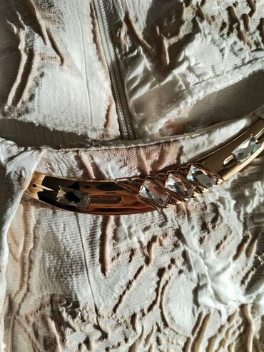 - Detalji: ukrasni zlatni pojas sa kristalnim kamenčićima (odvojiv), ističe struk; diskretna metalna pločica sa logotipom brenda.