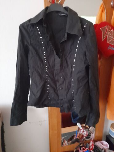 NitneCrna ženska košulja sa dugim rukavima i kragnom, brend SABRA, veličina 40. Model na kopčanje sprijeda (dugmad po celoj dužini). Ukrasne srebrne nitne/kamenčići postavljeni vertikalno s obe strane prednjeg dela i na ramenima stvaraju vizuelno izdužen efekat. Blago strukiran kroj, klasična dužina do kuka. Materijal je lagan i tanji, prijatan za svakodnevno nošenje ili večernje kombinacije. Elegantna i lako se kombinuje uz farmerke, pantalone ili suknju.