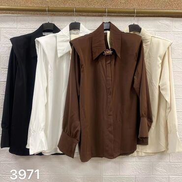 SatenElegantna ženska košulja sa dugim rukavima i skrivenom kopčanjem. Moderan, izdužen kragnu prati dekorativna broš-kopča/dugme na vrhu, a rukavi imaju blago naglašene manžetne sa dugmićima. Ravnog, blago komotnog kroja – lako se uklapa u poslovne, svečane i smart-casual kombinacije, uz suknju, pantalone ili farmerke.