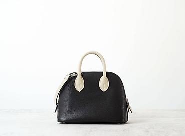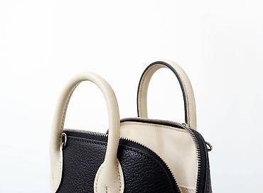 Elegantna torba – crno‑bela, kožna, mini bowling/satchel stil.