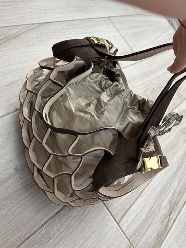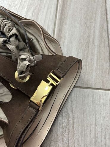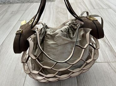 - Boje: tamno braon spolja, bež mreža/ivice, zlatni metalni detalji, svetla bež unutrašnja vrećica.