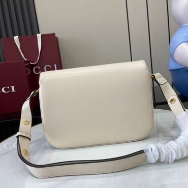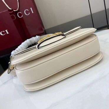 Elegantna ženska torba preko ramena od glatke bele kože sa prepoznatljivom zlatnom metalnom kopčom u obliku polukruga. Kompaktna pravougaona forma sa preklopom na magnet i dekorativnim metalnim det...