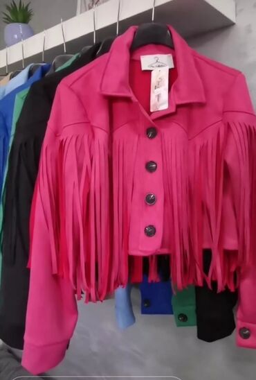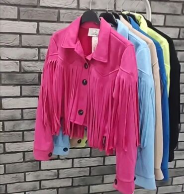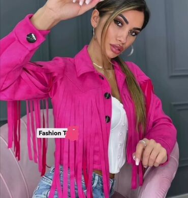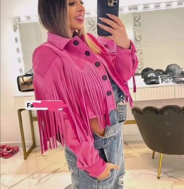 Ženska kratka jakna u jarko ružičastoj boji, izrađena od materijala koji podseća na antilop, sa dugim resama duž rukava i prednje strane. Jakna ima klasičnu kragnu i kopčanje na dugmad, pružajući moderan i upečatljiv izgled. Sa svojim jedinstvenim dizajnom, ova jakna je idealna za slojevito oblačenje i dodavanje teksture svakoj odevnoj kombinaciji, pogodna za različite prilike od ležernih izlazaka do večernjih događaja.
