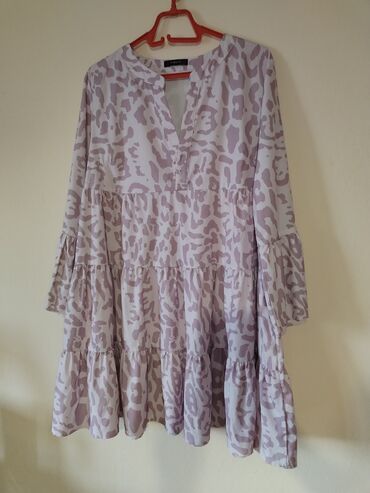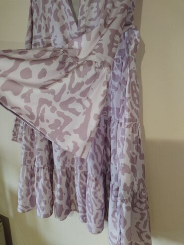 Lepršava ženska haljina s printom u svetloljubičastim tonovima.