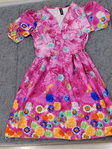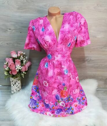 Ženska letnja haljina, mini dužine, u intenzivno roze nijansi sa bogatim cvetnim printom u više boja (narandžasta, plava, zelena, žuta).