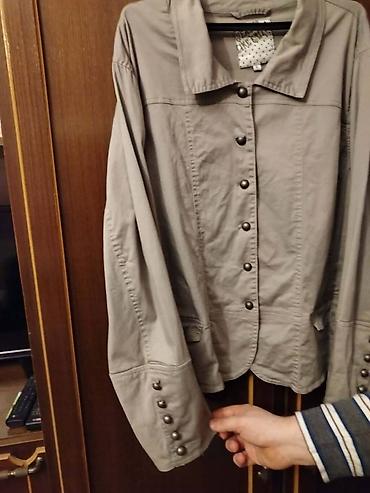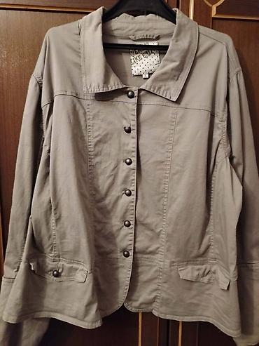 Ženska jakna ležernog stila, izrađena od pamučnog materijala u sivo-kaki boji. Jakna ima klasičnu kragnu i kopčanje na dugmad duž prednje strane, kao i duge rukave sa dugmadima na manžetnama. Na donjem delu prednje strane nalaze se dva džepa sa preklopima. Pogodna je za svakodnevno nošenje u prolećnim i jesenjim mesecima.