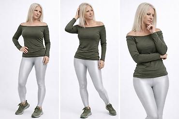 - Kroj: uska silueta, otkrivena ramena (ravan, elastičan izrez koji stoji preko ramena), dugi rukavi