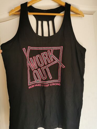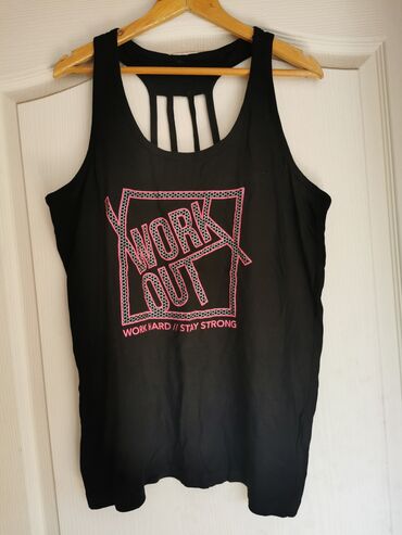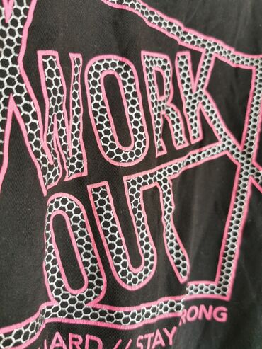 - Dizajn: prednji print “WORK OUT” u roze boji sa heksagonalnim uzorkom; ispod natpis “WORK HARD // STAY STRONG”