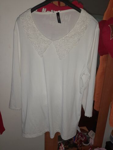Bela ženska majica dugih rukava sa dubokim V izrezom. Asimetrično ukrašena šarenim dugmićima uz dekolte (crveno, zeleno, narandžasto). Prednja strana ima veliki žuti print sa slovima i natpisima u ...