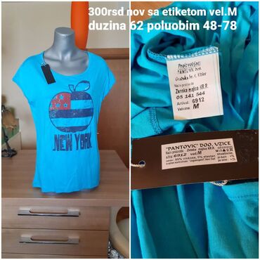 Na fotografiji je i originalna viseća etiketa. Tekst na slici: 300 rsd, nov sa etiketom, vel. M, dužina 62, poluobim 48–78.
