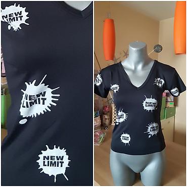 Ženska majica kratkih rukava, crna, sa belim printom “NEW LIMIT” po celoj površini. V-izrez, klasičan kroj koji prati liniju tela.