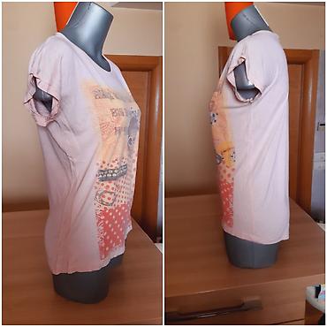 Ženska majica sa kratkim rukavima, svetlo roze boje, sa printom u retro/pop-art stilu na prednjem delu (motiv devojke sa naočarima, tačkice i dekorativni elementi u narandžasto‑bež tonovima). Okrugao izrez, spuštena ramena i blago opušten kroj.