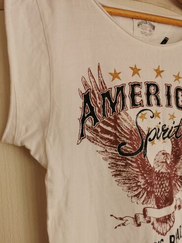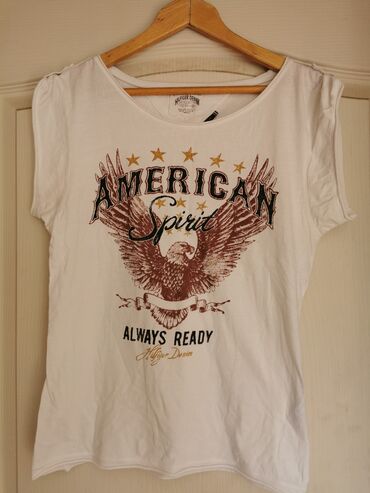 Ženska majica kratkih rukava Tommy Hilfiger (Hilfiger Denim). Bela boja, mekana pamučna tkanina, širok okrugli izrez. Napred veliki vintage print: orao raširenih krila, zvezde i natpisi “American Spirit” i “Always Ready”, sa potpisom “Hilfiger Denim”. Silueta blago opuštena, rukavi blago nabrani na ramenima. Idealna za ležerne kombinacije uz farmerke ili šorts. Etiketa brenda vidljiva sa unutrašnje strane.