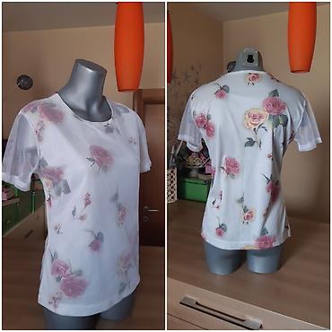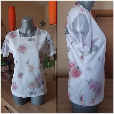Ženska majica Rain Dream, veličina XL. Bele boje sa romantičnim cvetnim printom (ruže) po celoj površini. Kratak rukav od prozračnog tila/mreže, klasičan okrugao izrez. Materijal: 65% poliester, 35% pamuk – lagana i prijatna za nošenje.