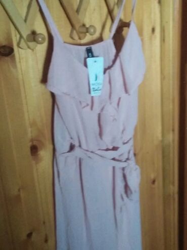 Dugačka ženska haljina roze boje, sa tankim bretelama i volanima. Haljina je strukirana i vezuje se pojasom u istom tonu, što omogućava prilagođavanje obliku tela. Izrađena je od prozračnog materijala idealnog za tople dane i svečane prilike. Ležeran, ali elegantan kroj čini je pogodnom za različite stilove i događaje.
