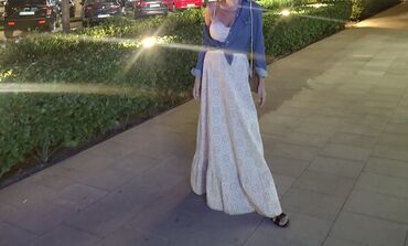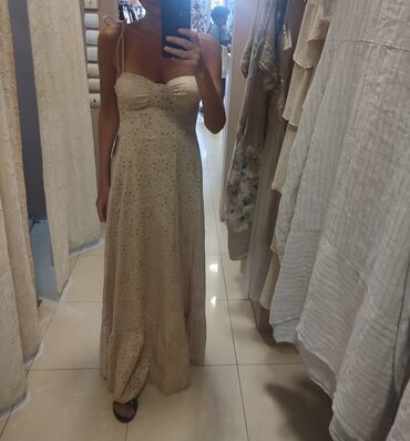 Dugačka ženska haljina bež boje sa diskretnim tačkastim dezenom. Haljina ima tanje bretele koje se vezuju na ramenima, naglašen bust sa blagim nabiranjem i blago proširen donji deo. Idealna je za tople letnje dane i ležerne kombinacije.