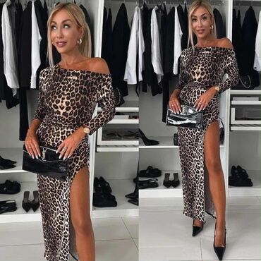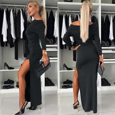 - Model: duga haljina uskog kroja sa visokim bočnim prorezom