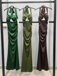 Elegantna duga haljina sa ukrštenim bretelama oko vrata i senzuanlnim izrezom na prednjoj strani. Kroj prati liniju tela, sa laganim naborima oko struka i bokova koji vizuelno oblikuju figuru, a donji deo pada ravno do poda za sofisticiran efekat. Model je bez rukava, sa otvorenim leđima i vezivanjem oko vrata.