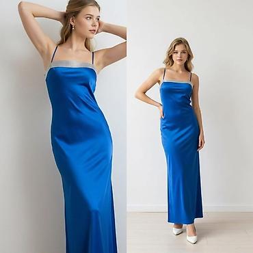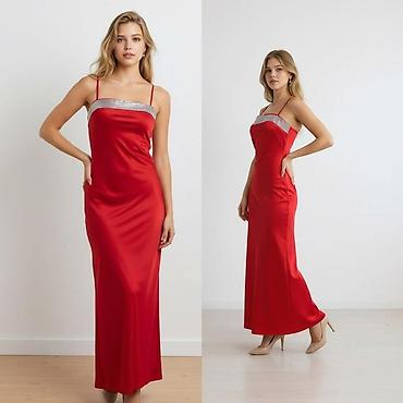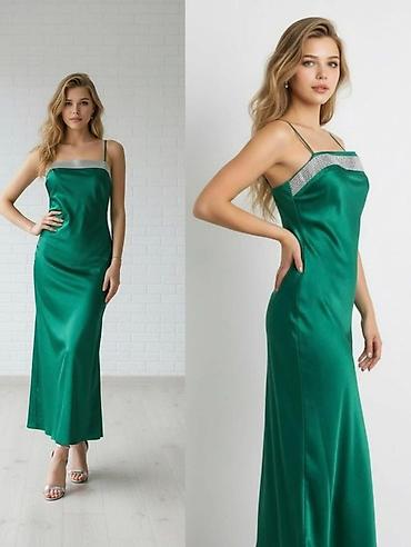 Svečana duga haljina sa tankim bretelama i ukrasnim štras po gornjem rubu. Model je ravne, blago pripijene linije koja lepo prati figuru i pada do poda. Materijal je svilenkast, sa sjajnim finišem koji daje elegantan izgled i lepo “klizi” pri hodu. Izrez je pravougaonog oblika, diskretno naglašen svetlucavim detaljima. Leđa su jednostavna, bez dodatnih ukrasa, sa istim tankim bretelama.