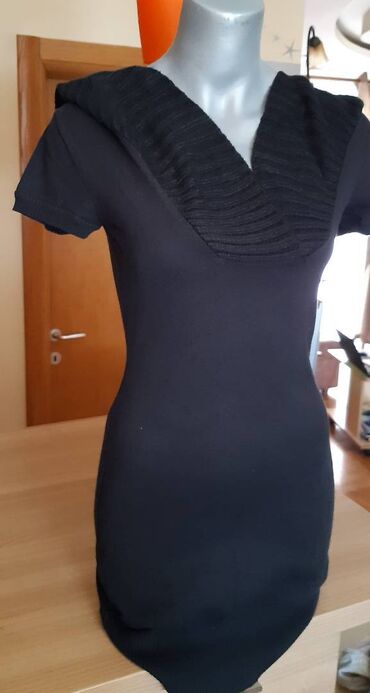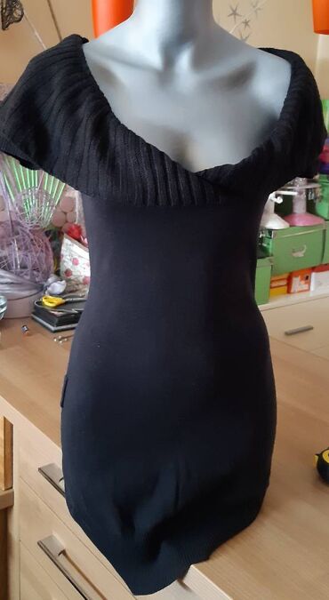 Haljina Melrose, crna, uskog kroja sa širokim rebrastim okovratnikom koji može da se nosi spušten preko ramena ili kao dublji V-izrez. Kratki rukavi, rastegljiv pleteni materijal, rebrasti porub na dnu.