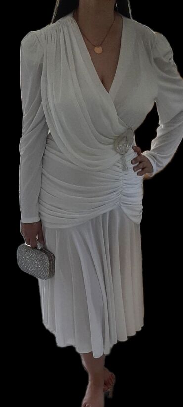 Elegantna bela midi haljina sa drapiranim detaljima.