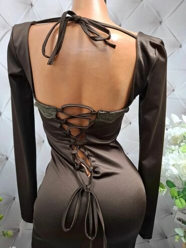 Elegantna večernja haljina – crna, duga, sa dramatičnim šlepom i visokim šlicem. - Kroj: sirena/suknja sa naborima napred, visoki otvor na butini, produženi asimetrični šlep sa strane. - Gornji de...