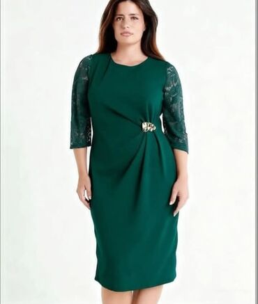 Elegantna haljina za punije dame,midi dužine sa 3/4 čipkanim rukavima. Odgovara L XL 2XL 3XLV4XL. Klasičan okrugli izrez, diskretno nabrana strana sa dekorativnom zlatnom kopčom koja vizuelno sužava struk. Kroj prati liniju tela bez preuskog efekta, pogodan za svečane prilike i posao.