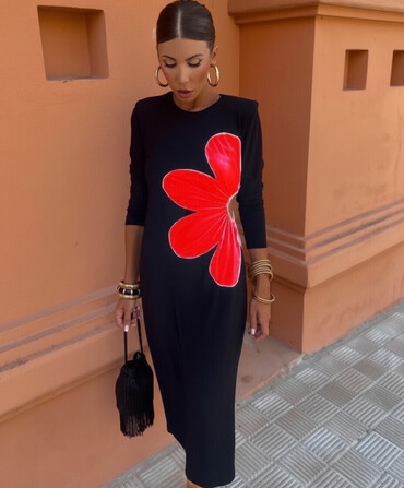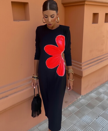 Midi haljina sa velikim cvetnim motivom i bočnim naborom