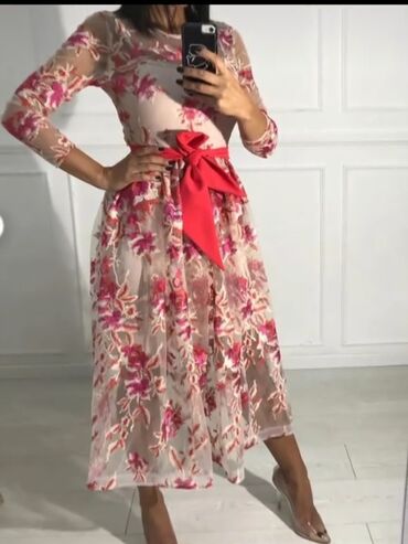 Elegantna midi haljina od providnog tila sa cvetnim vezom. Osnova u nežnoj nude nijansi, preko koje je proziran sloj sa bogatim floralnim motivima u ružičastim i crvenim tonovima. Kroj: lagano A linija, dužina ispod kolena, okrugli izrez i 3/4 rukavi. U struku je upadljiv satenski pojas u jarko crvenoj boji koji se vezuje u mašnu i naglašava figuru. Lepršava suknja sa blagim naborima pruža romantičan izgled. Idealna za svečane prilike, koktel, venčanja ili večernje izlaske. Može se kombinovati sa nude ili prozirnim štiklama i minimalističkim nakitom.