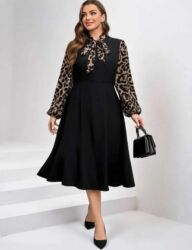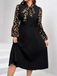 Elegantna midi haljina sa efektom spajanja klasične crne osnove i rukava sa modernim animal printom. Gornji deo je čistih linija, ukrašen ženstvenom mašnom na vratu, dok su dugi, blago puf rukavi od lepršavog materijala sa leopard šarom. Struk je suptilno naglašen, a A-kroj suknje lepo pada i obezbeđuje udobnost i slobodu pokreta. Idealna za posao, večernje izlaske i svečane prilike.