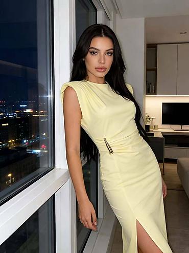 Elegantna midi haljina u kobalt-plavoj boji - Kroj: uska silueta, visoki struk, midi dužina - Gornji deo: dugi rukavi, V-izrez, naglašena ramena - Detalji: otvori na bokovima, ukrasna kopča u zlat...