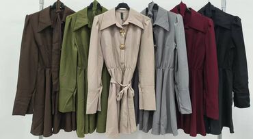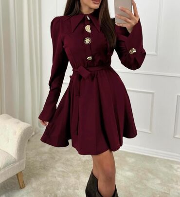 Ženska mini haljina A-kroja sa dugim rukavima i kaišem za struk. Model ima izražen špic kragnu, blago naboren struk i lepršavu suknju koja prati liniju tela. Zatvaranje je napred ukrasnim dugmadima u zlatnoj boji sa motivima sunca i školjke, a na rukavima se nalaze ukrasni manžetni sa dugmetom. Materijal je prijatan, srednje debljine, pogodan za jesen/zimu i prelazne dane.