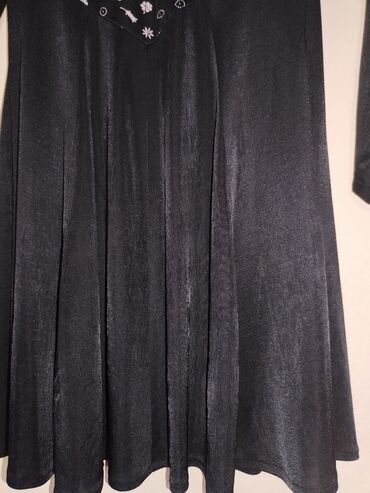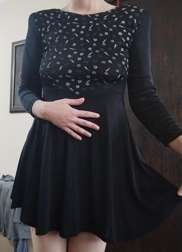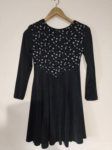 Crna haljina sa dugim rukavima i kružnom, lepršavom suknjom. Gornji deo je ukrašen panelom u obliku blagog V (prema struku) sa sitnim belim motivima (cvetići, krugovi i simboli), dok je ostatak haljine jednobojan. Okrugao izrez, struk naglašen, suknja se širi u A-kroju i lepo pada. Tkanina je meka i elastična, prijatna za nošenje, sa blagim sjajem. Dužina iznad kolena. Pogodna za svakodnevne prilike i večernje izlaske; lako se kombinuje sa čarapama, čizmama ili baletankama.