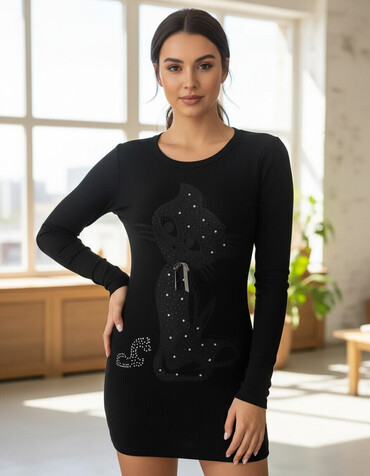 Drugi brendCrna mini haljina dugih rukava, ukrašena aplikacijom mačke. Mačka je detaljno izrađena sa svetlucavim aplikacijama, što haljini daje poseban šarm. Izrez je okrugao, a kroj haljine prati liniju tela, ističući figuru. Idealna za svakodnevno nošenje ili ležernije prilike, ova haljina kombinuje udobnost i stil.