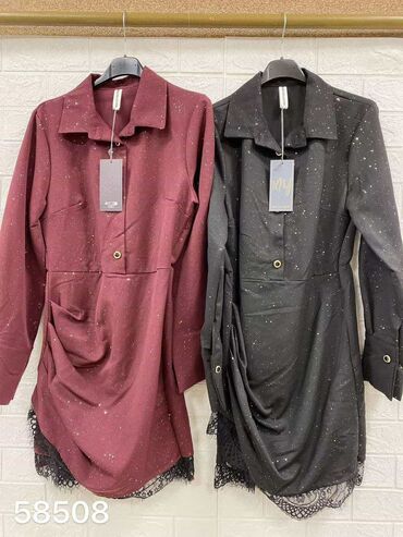 Haljina sa dugim rukavima i košulja-kragnom, ukrašena diskretnim sjajnim tačkicama. Asimetričan kroj sa naborima na bokovima vizuelno stanjuje struk, dok duboki V izrez sa nizom metalnih dugmića omogućava podešavanje dekoltea. Donji rub je naglašen efektnom čipkom koja proviruje ispod preklopa.
