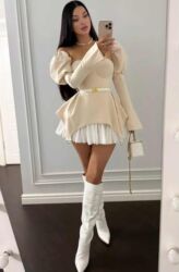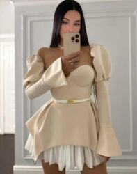 - Elegantna mini haljina u bež nijansi sa belim naboranim donjim delom