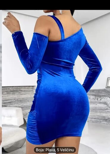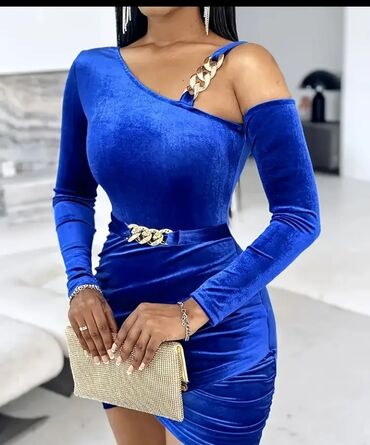 Elegantna ženska mini haljina kraljevsko plave boje, izrađena od mekog pliša. Haljina ima asimetričan izrez, jedno rame je potpuno otkriveno, dok je drugo prekriveno dugim rukavom. Detalji u obliku zlatnih lanaca krase rame i struk, dodajući sofisticiranu notu. Nabori sa strane vizuelno naglašavaju figuru i daju haljini dinamiku. Idealna je za večernje izlaske, koktele ili posebne prilike kada želite da se istaknete.