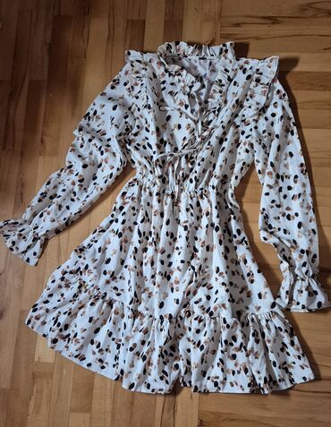Ženska haljina sa printom u bež, braon i crnim tonovima na beloj podlozi.