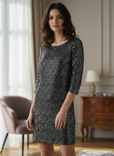 - Leđa: glatka crna tkanina sa šljokicama na rukavima; prednji deo u potpunosti šljokičast