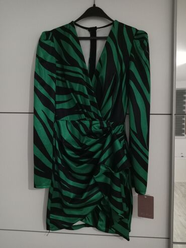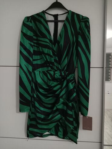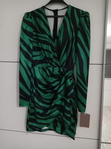 Zelena mini haljina sa crno-zebra printom. Satenski sjaj, preklopljen V-izrez, dugi rukavi sa blagim naglašenim ramenima. Struk nabrano drapiran, sa asimetričnim slojevima i kaskadom napred koja formira efektan volan. Leđa imaju diskretnu suzu/otvor pri vrhu i zatvaranje skrivenim rajsferšlusom. Dužina iznad kolena, kroj koji prati liniju tela. Idealna za večernje izlaske i specijalne prilike. Na etiketi je brend “Miss Zara”.