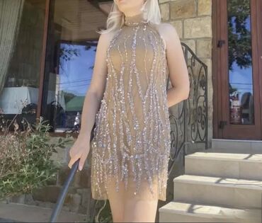 Šik mini haljina bez rukava sa visokim okovratnikom u nijansi nude/bež. Model je pripijenog kroja, dužine iznad kolena, sa providnim slojem preko baze koji stvara efekat “second skin”. Ceo prednji i bočni deo ukrašen je gustim aplikacijama od srebrnih šljokica i sitnih kamenčića postavljenih u vertikalne, talasaste linije koje vizuelno izdužuju figuru i snažno reflektuju svetlo. Leđa su glatka sa istim dekorom sa strane, a ivice su diskretno ojačane za čist finiš.