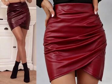 Ženska mini suknja od eko kože - Materijal: meka, glatka eko koža sa diskretnim sjajem - Kroj: slim fit, visoki struk - Dizajn: asimetrično preklapanje napred sa drapiranim naborima koji vizuelno ...Stanje: