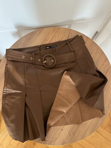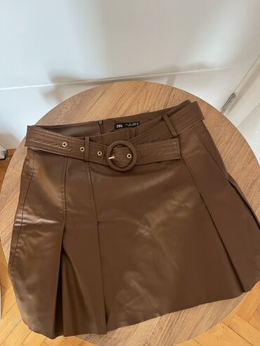 BraonZara mini suknja od eko kože u tamno braon boji. A-kroj sa dubokim preklopima/plikama napred i sa strane za efektan volumen. U kompletu je širok remen u istom materijalu, sa kružnom kopčom i zlatnim okovima, plus prošiveni detalji. Suknja ima skriveni bočni rajsferšlus. Unutrašnjost je mekana, nalik brušenoj teksturi radi udobnosti. Dužina mini, idealna za kombinovanje uz čizme ili patike. Na etiketi je naznačeno: ZARA, veličina L . Klasična, moderna silueta u neutralnoj braon nijansi.