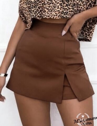 Ženska mini suknja sa visokim strukom i diskretnim bočnim prorezom. Model je A-kroja, glatke teksture, sa čistim linijama koje vizuelno izdužuju figuru. Prorez je postavljen na desnoj strani i preklopljen, što daje elegantan izgled i olakšava kretanje. Suknja je prikazana u više boja (bež, braon, bela, roze), pogodna za kombinovanje uz crop top, košulju ili blejzer, kao i uz patike, sandale ili potpetice. Idealna za svakodnevne kombinacije, večernje izlaske i sve prilike kada želite minimalistički, moderan stil.