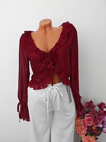 Ženska bluza dugih rukava u tamno braon boji. Model sa volanom oko okovratnika i uz dugmad na prednjem delu (kratko kopčanje na nekoliko dugmića). Materijal je mekan, prijatan za svakodnevno nošenj...
