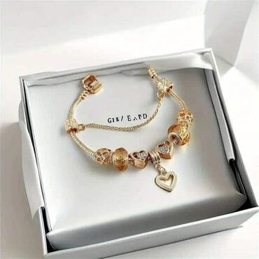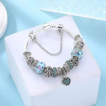 - Dizajn: lančić sa zmijskim pletenjem i sigurnosnom kopčom, dopunjen nizom šarmova i perli; centralni privezak u obliku srca.