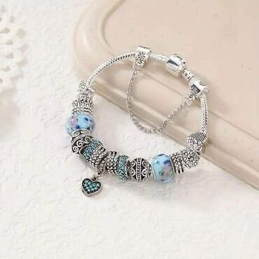 2) Srebrni ton: bogato gravirani šarmovi u srebru, staklene perle sa cvetnim/degradé printom u plavo‑ružičastim tonovima, šarmovi sa tirkiznim kristalima i viseći privezak srce sa tirkiznim kamenčićima.