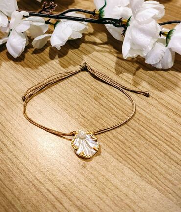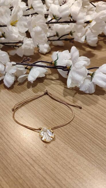 Dimenzije: prilagodljive (klizni mehanizam). Materijali: sedefasti privezak, metalni zlatni akcenti, tekstilni konac.