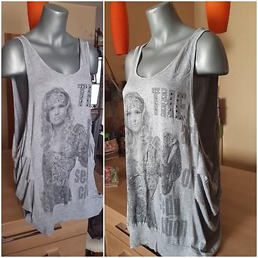 Siva ženska majica bez rukava (tunika) iz Italije. Model je oversize sa dubljim izrezom ispod ruke, naborima sa strane i širokim donjim porubom. Napred je veliki print sa ženskim likom i natpis „THE“ ukrašen metalnim nitnama. Materijal je mekan i lagan, prijatan za leto ili slojevito nošenje.